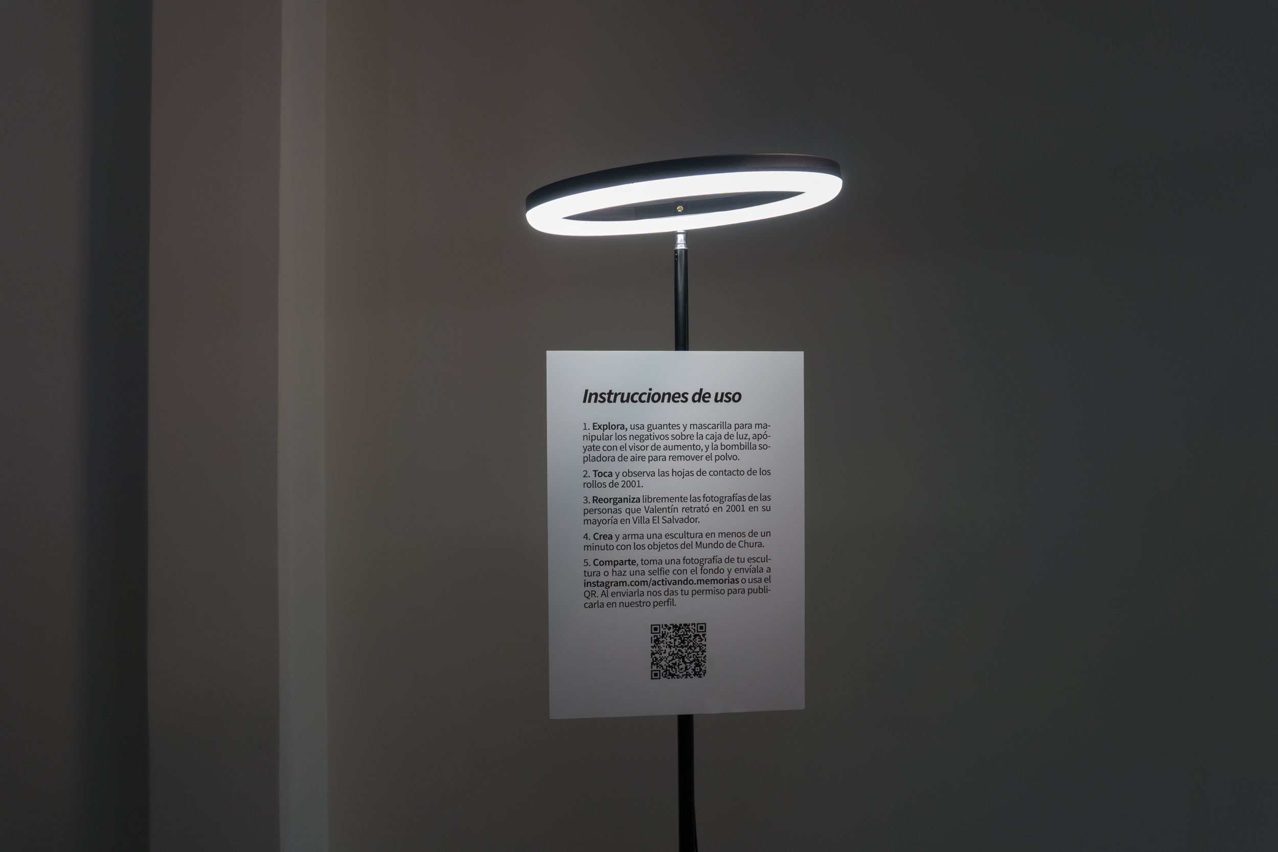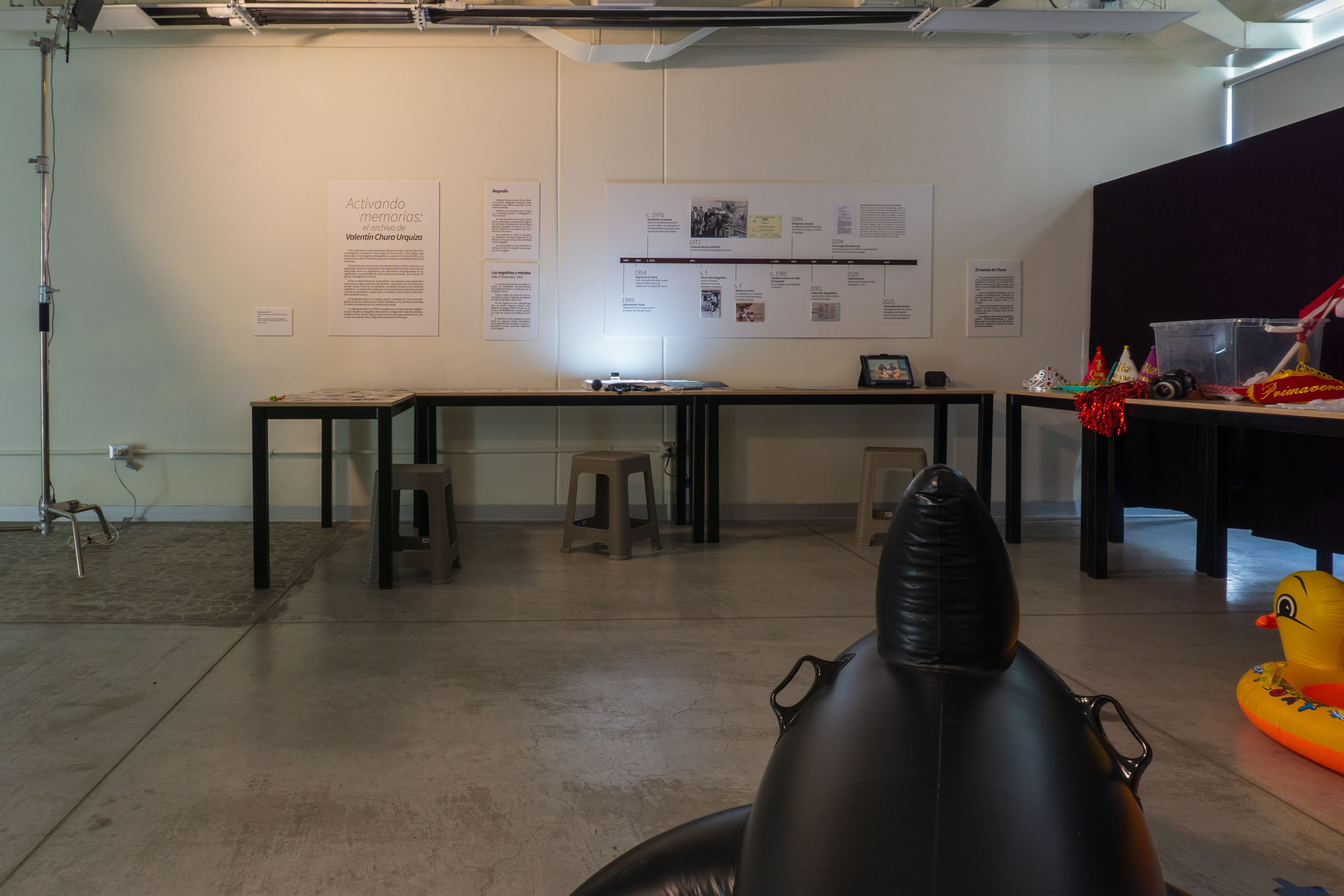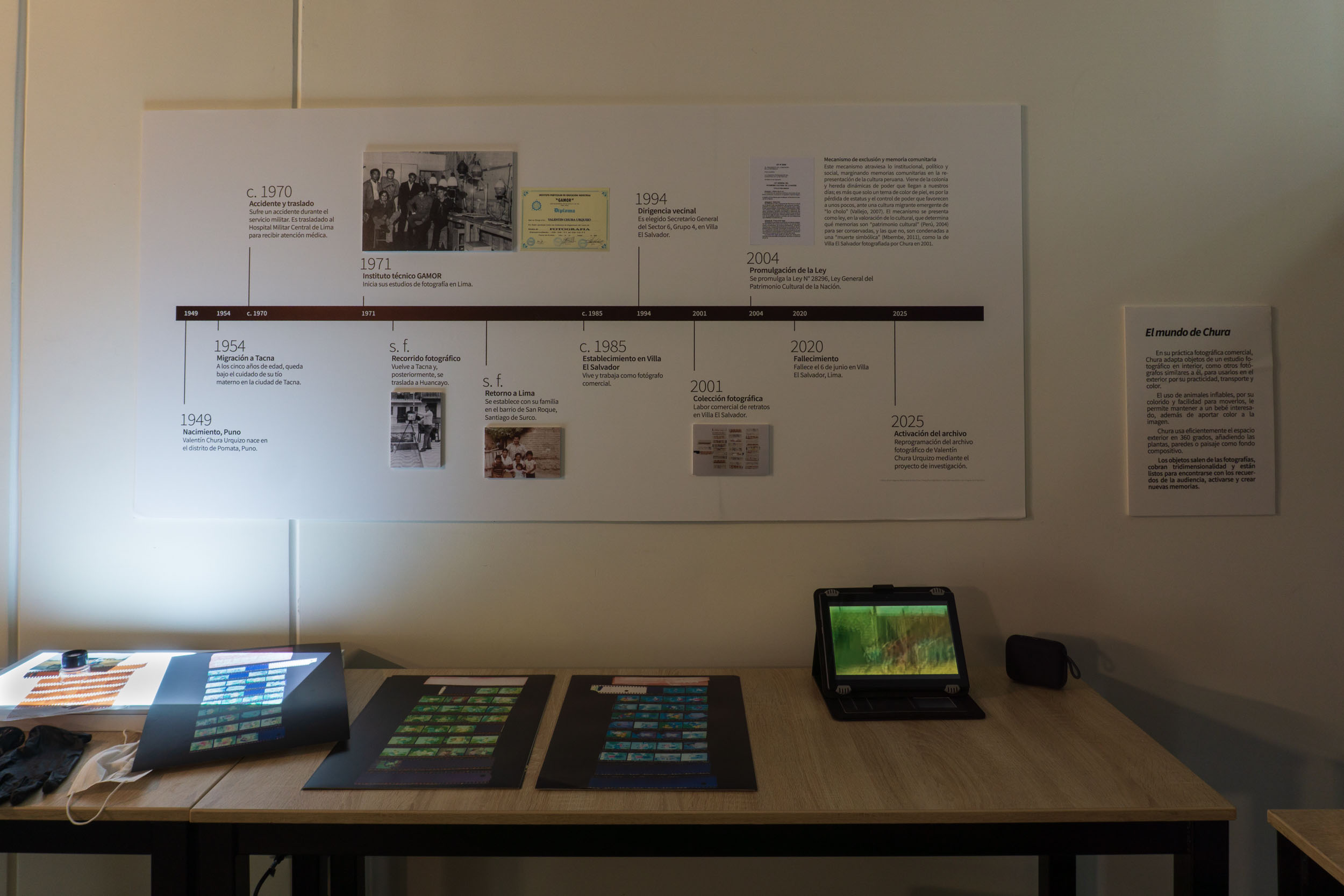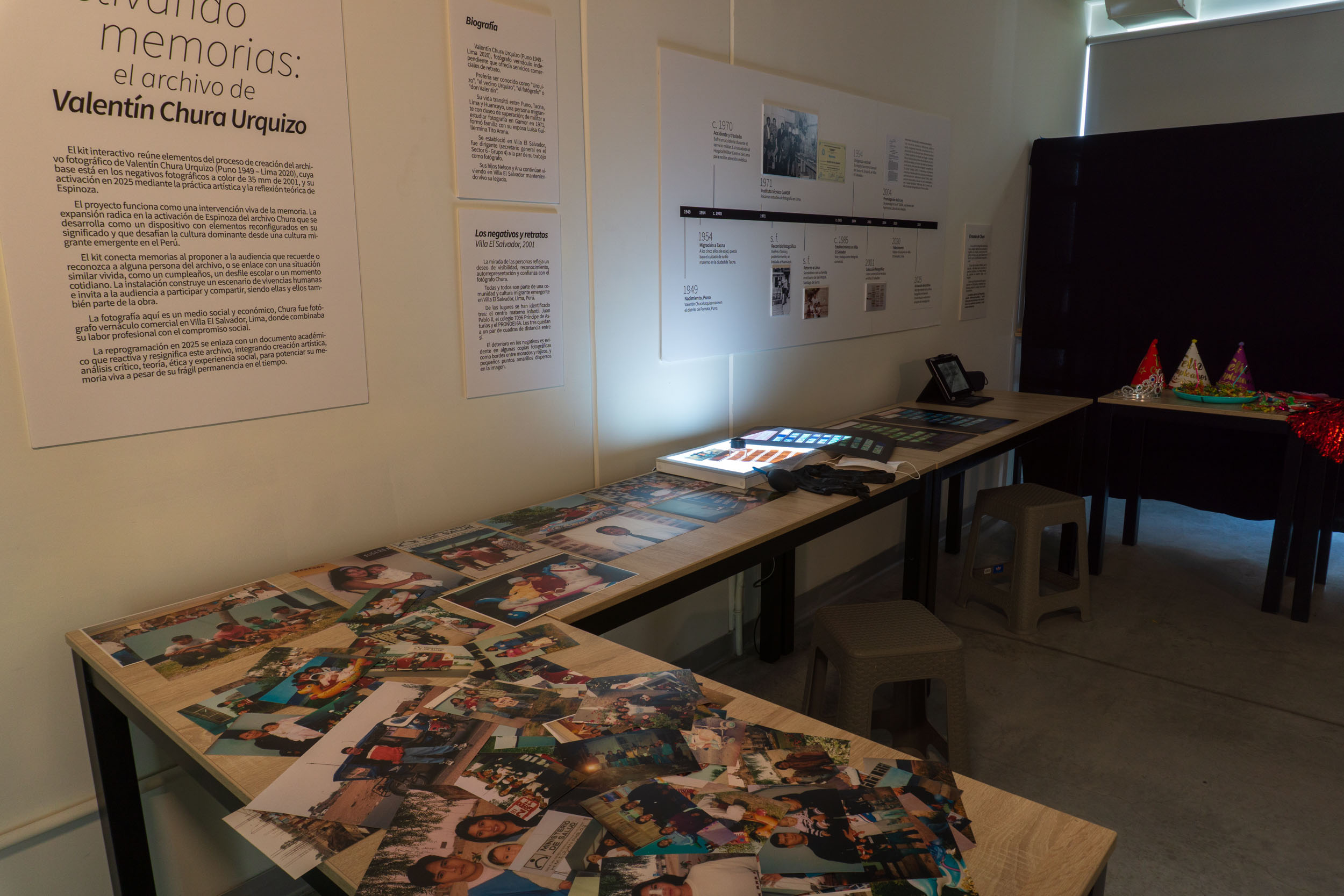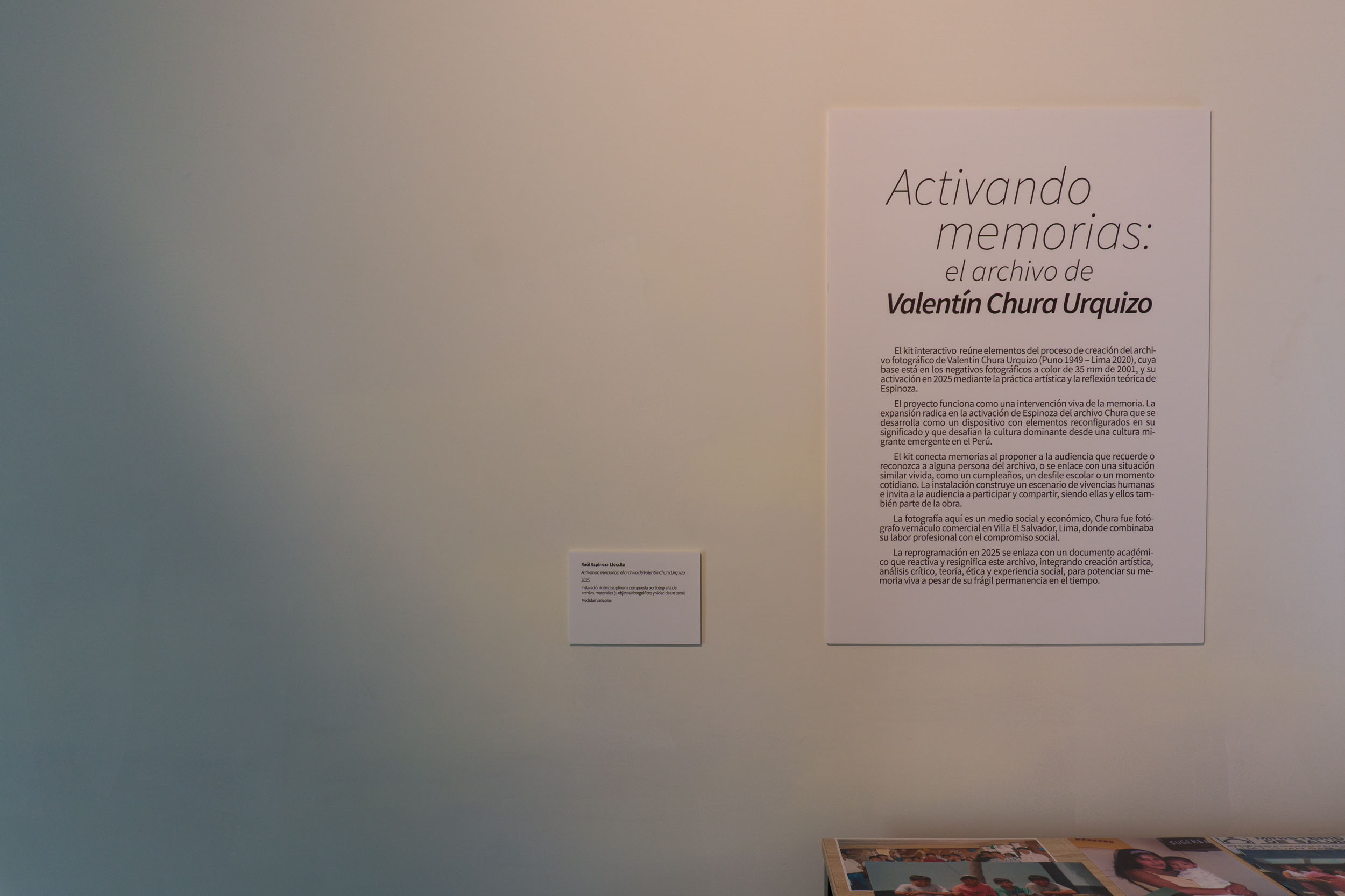 Es un kit interactivo que reúne elementos del proceso de creación del archivo fotográfico de Valentín Chura Urquizo (Puno 1949 – Lima 2020), cuya base está en los negativos fotográficos a color de 35 mm de 2001, y su activación en 2025 mediante la práctica artística y la reflexión teórica de Espinoza. El proyecto funciona como una intervención viva de la memoria. La expansión radica en la activación de Espinoza del archivo Chura que se desarrolla como un dispositivo con elementos reconfigurados en su significado y que desafían la cultura dominante desde una cultura migrante emergente en el Perú. El kit conecta memorias al proponer a la audiencia que recuerde o reconozca a alguna persona del archivo, o se enlace con una situación similar vivida, como un cumpleaños, un desfile escolar o un momento cotidiano. La instalación construye un escenario de vivencias humanas e invita a la audiencia a participar y compartir, siendo ellas y ellos también parte de la obra. La fotografía aquí es un medio social y económico, Chura fue fotógrafo vernáculo comercial en Villa El Salvador, Lima, donde combinaba su labor profesional con el compromiso social. La reprogramación en 2025 se enlaza con un documento académico que reactiva y resignifica este archivo, integrando creación artística, análisis crítico, teoría, ética y experiencia social, para potenciar su memoria viva a pesar de su frágil permanencia en el tiempo.